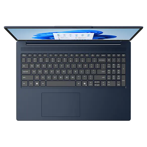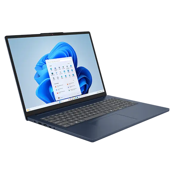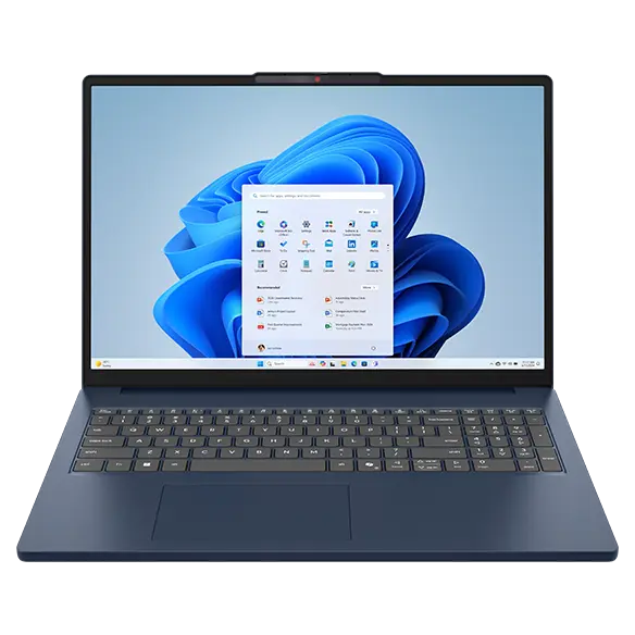 Front view of the laptop displaying a vibrant Windows 11 interface with a centered pop-up menu and soft wave patterns. The Lenovo IdeaPad Slim 3i Gen 10 features a dark blue keyboard and large touchpad, ensuring comfort and efficiency for long work sessions.