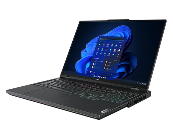 Side facing Lenovo Legion Pro 7 Gen 8 (16" AMD) gaming laptop, opened, showing display with Windows 11 bloom & icons, plus keyboard & right side ports
